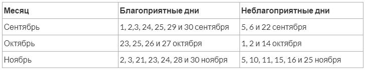 V druhom jesennom mesiaci sa výsadba duplikuje, aby sa zabezpečil zber pikantnej zeleniny. Mesačný kalendár na výsadbu cesnaku v októbri naznačuje priaznivé termíny. Práce sa vykonávajú 23., 25., 26. a 27. októbra. Spolu s konzultáciou s kalendárom sa oplatí skontrolovať aj dlhodobú predpoveď meteorológov. Koniec koncov, nesprávne zvolený čas v pomere k stavu pôdy a teplote vzduchu pri výsadbe cesnaku v októbri podľa kalendára vytvoreného astrológmi hrozí, ak nie strata, potom výrazné zníženie výnosu: