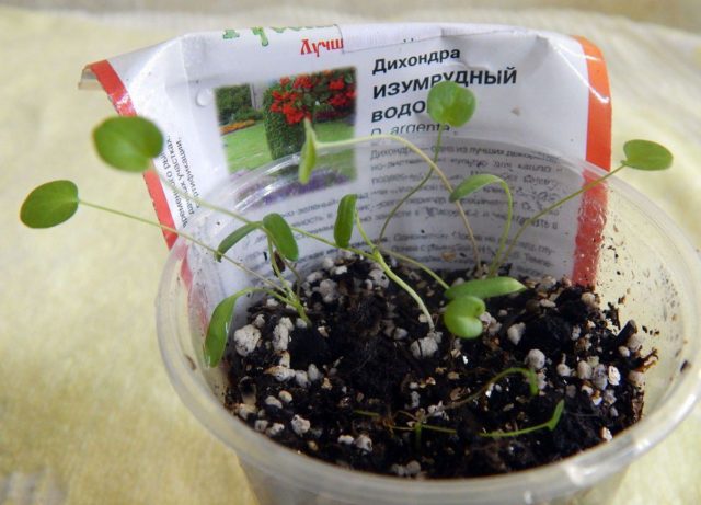 Ak bol výsev semien dichondry pre sadenice vykonaný správne, prvé výhonky je možné vidieť za týždeň. Mladé výhonky rastú pomaly, z tohto dôvodu je lepšie odstrániť kryt z nádoby, keď sú dostatočne silné.