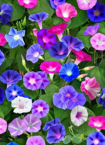Fotografia Ipomoea Purple zobrazuje zmes kvetov rôznych odtieňov.