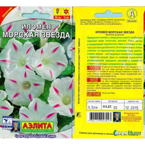 Semená produkcie agrofirmy "Aelita". Ako môžete vidieť z fotografie, odroda Ipomoea fialová Star Waltz kvitne veľkými lievikovitými kvetmi až do priemeru 12 cm. Dĺžka stonky môže dosiahnuť 3 m.