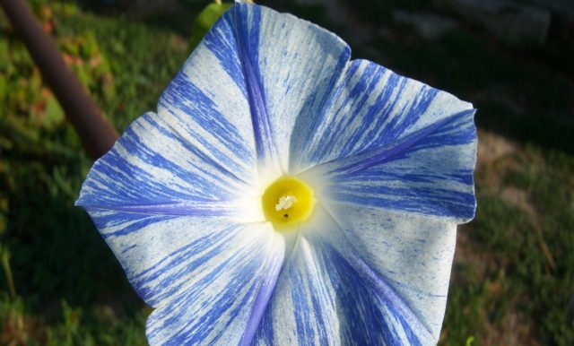 - Lietajúci tanier... Jedna z odrôd s najväčšími, až 15 cm, modro-bielymi kvetmi. Výška dosahuje 2,5 m.
