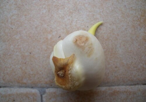 Príznaky sklerociálnej hniloby - charakteristický belavý kvet na žiarovkách tulipánov Miranda, ktorý časom zhnedne